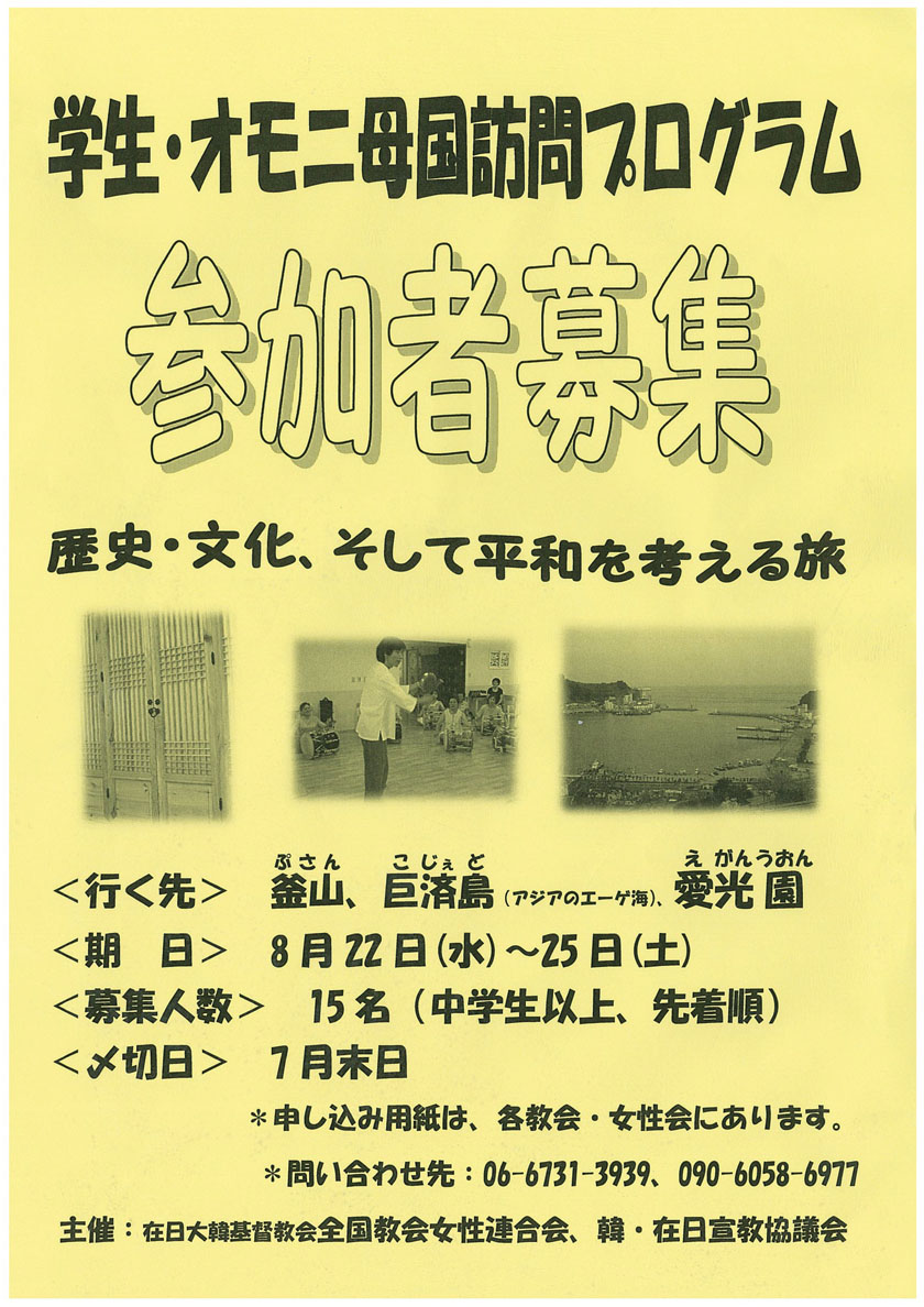 今夏、「学生・オモニ母国訪問」を行います。このプログラムは韓国の三教団女性会と韓国女性長老会連合会のご理解と協力を得て、私たちの全国女性会が主催して行ってきた貴重な機会です。韓国の文化と日韓両国間の正しい歴史を知ることは、若い世代のアイデンティティを確立し、クリスチャンとしての視野を広げることを助けます。青少年が新たな一歩を踏み出す機会となることを期待し、多くの方々に参加を勧めていただけます...(12-07-16)