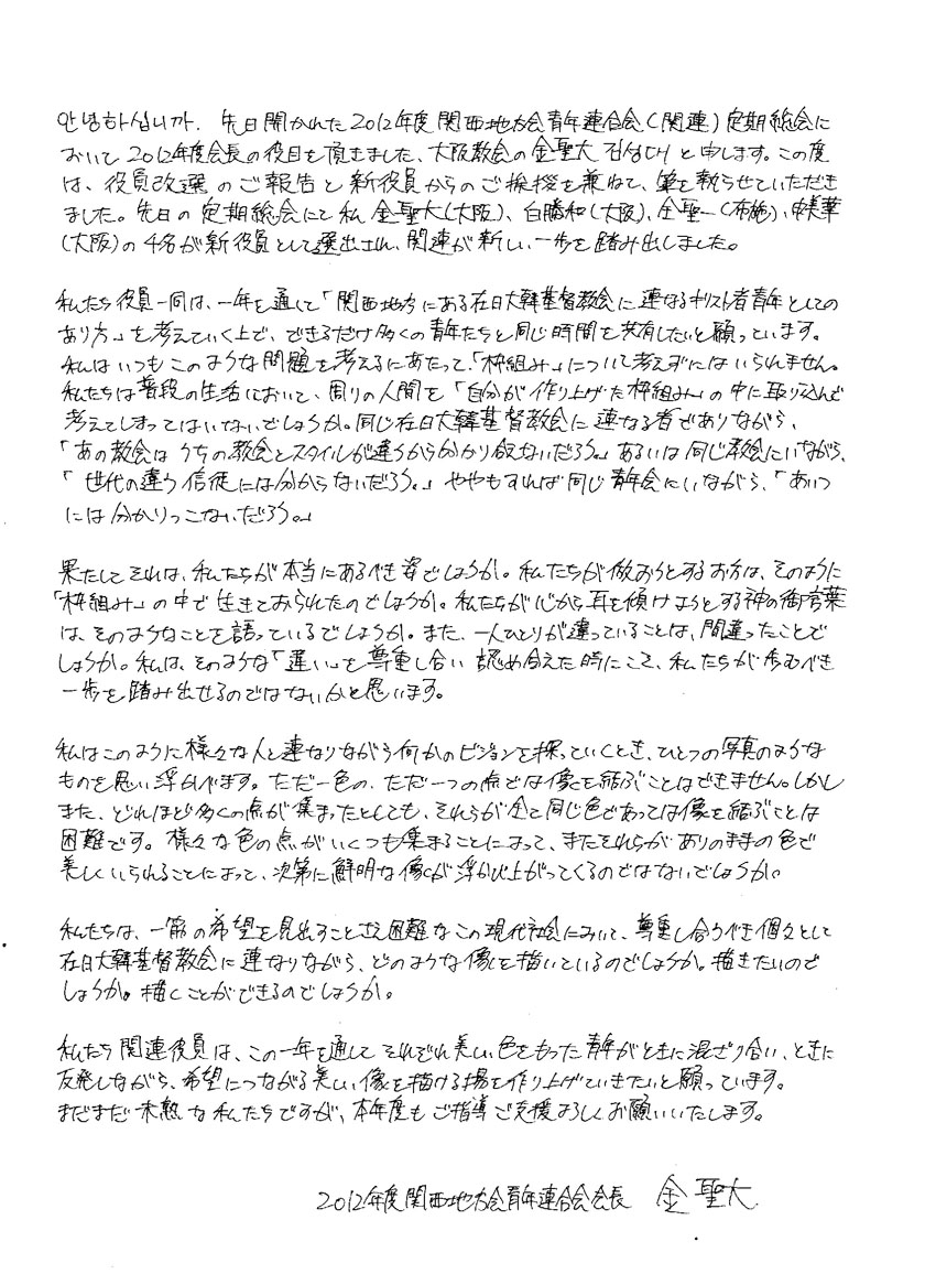 (関連)定期総会において2012年度会長の役目を頂きました、大阪教会の金聖大と申します。