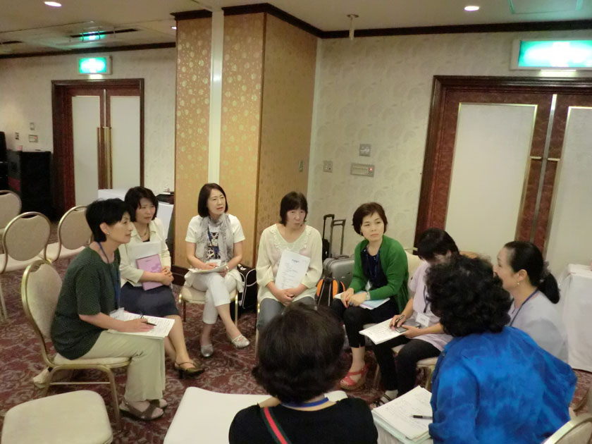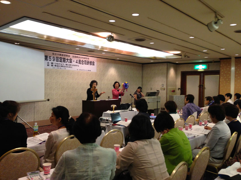 研修会においては、洪性完総幹事より「KCCJの問題点を探る」、金錦順長老(前宣教局長)より「教会の再生のために」、朴栄子総務より「風通しのよい教会を目指して~ふたつの提言~」という発題があった。その後、同じテーマでのグループディスカッションと全体討議もあり、活発な議論が繰り広げられた。各教会、各地方会で様々な問題が起こっている中、女性会員たちの話し合いは白熱したものとなった。閉会礼拝は信徒委員長の中江洋一牧師(広島教会)より「安心して行きなさい」(マルコ5:21-34)と題しての説教がなされ、2日間の大会・研修会は幕を閉じた。(報告:朴栄子)