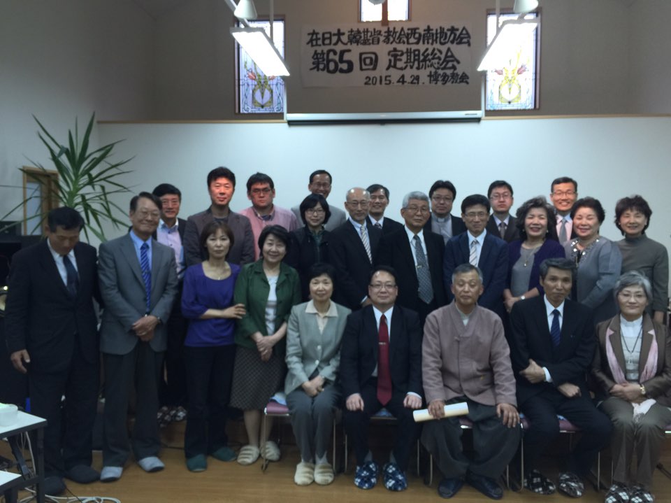 <西南地方会> 第65回 定期総会 4月29日(水)、博多教会にて、西南地方会「第65回定期総会」が開催された。 開会礼拝は、副会長姜富子長老の司会で、地方会長金明均牧師が「あなたがたの神を見よ」(イザヤ書40:9~11)と題して説教した後、辛治善牧師の司式で聖餐式を行った。 (15-04-30)