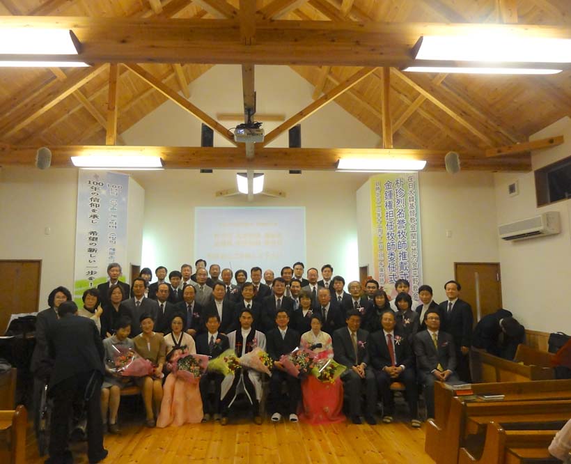 2012年11月11日(主)午後 4時より、平野教会において朴珍烈名誉牧師推戴式と金鍾権牧師の牧師委任式が執り行われた。