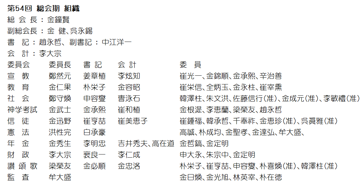 <組織> ・委員長:鄭然元牧師(大阪) ・委 員:姜章植牧師(書記、品川)、李炫知勧士(会計、女性会)、金承煕牧師(岡山)、辛治善牧師(別府)、崔光一長老(名古屋)、金錦順長老(布施)