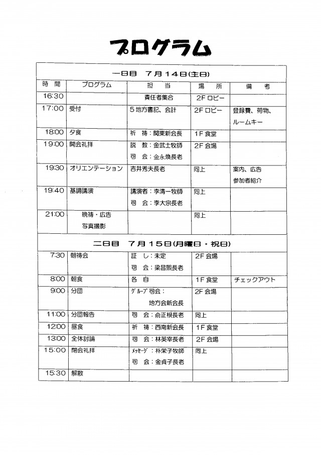 内容:「平和のきずなティーンズキャンプ」の件 「平和のきずなティーンズキャンプ」のご案内 主の聖名を賛美します。貴教会CSの益々のご発展を心よりお祈りします。 在日大韓基督教会教育委員会では...(13-05-07)