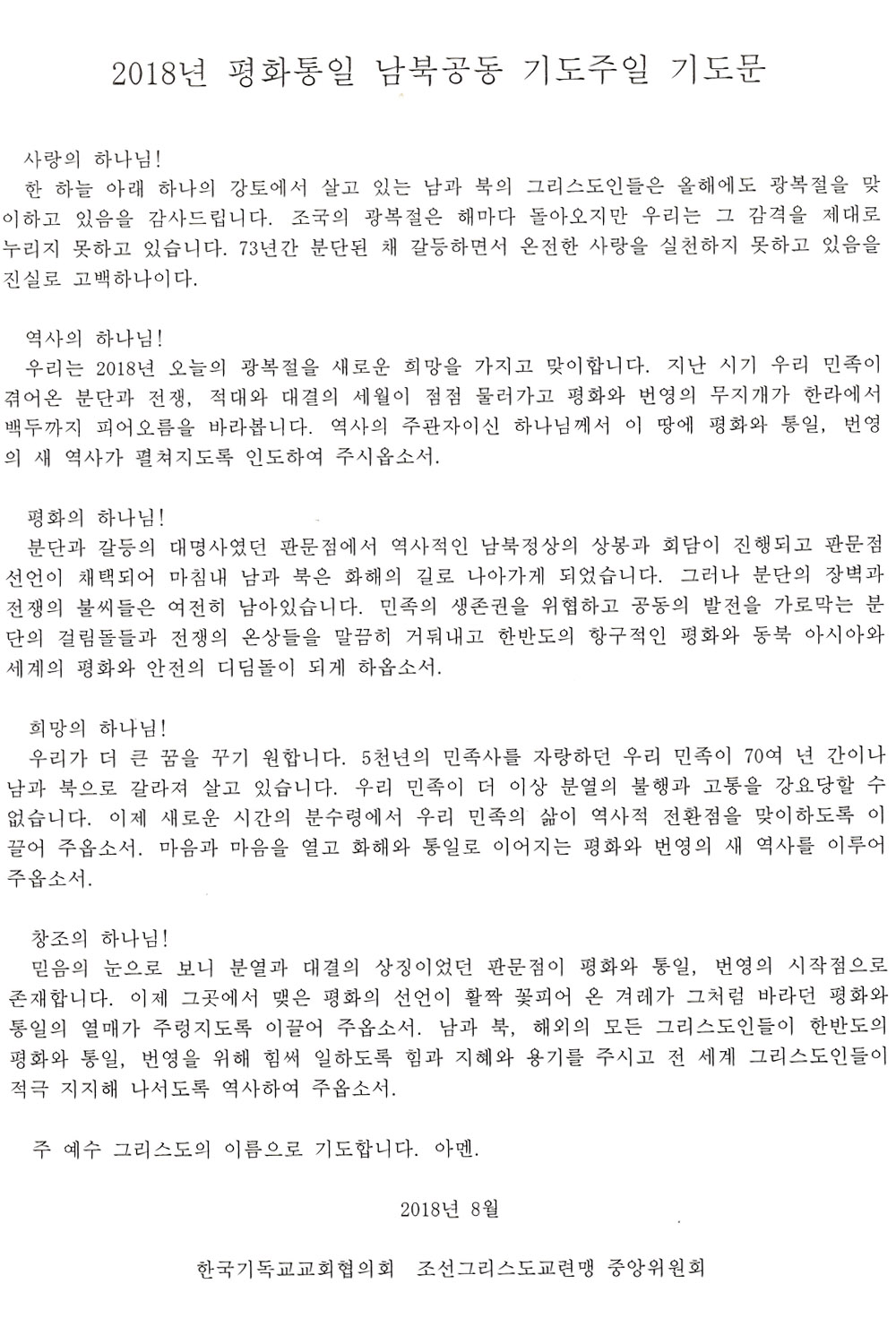 2018年 平和統一南北共同祈祷主日 祈祷文