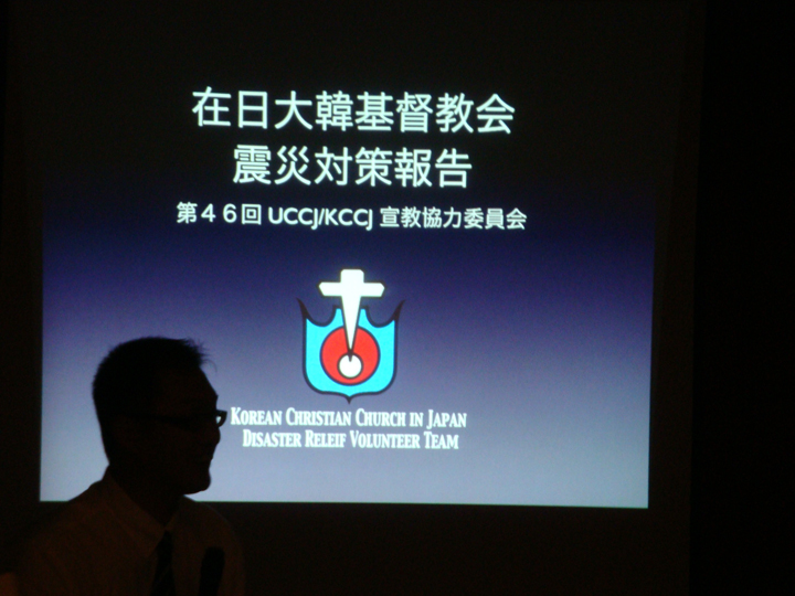 その後、雲然俊美牧師(UCCJ書記)の司会で、近藤勝彦東京神学大学学長が「両教会の宣教課題と宣教協力-日本における伝道を巡って-」について神学的な観点から講演した。夕食後、内藤留幸牧師(UCCJ総幹事)の司会で出席者の紹介・前会議録確認・両教会紹介・両教会東日本大震災の支援活動報告がなされた。許伯基牧師(KCCJ幹事、つくば東京教会)は、スライダーを通して仮設住宅炊き出し奉仕について、加藤誠牧師(UCCJ幹事)はエマオセンターを中心に奉仕をしていることを報告した。