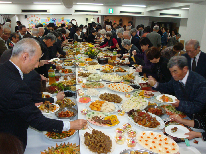 第2部は、名古屋教会の6階のホールで、朴太元牧師(豊橋教会)の司会で愛餐会形式で行われた。名古屋教会の女子宣教会の奉仕と日本キリスト教会の各教会からも持ち寄りの料理によって豊かで楽しい愛餐会がもたされた。