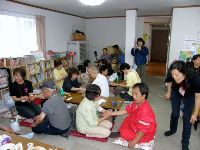 2日目19日(火)は、郡山市内の仮設住宅(310世帯)での炊き出しとイベント。韓国の餅と缶入りシッケなどを配布し、集会所では落語と讃美、ヘアカットとハンドマッサージを準備。喫茶コーナーでくつろいでいた方々にハンドマッサージを行った。最初は遠慮していた男性陣も、強引な誘いにのってマッサージを受けると、気持ちがいいと喜んでおられた。「話を聞く人が来てくれたのは10ヵ月ぶり」とのことで胸が痛んだ。